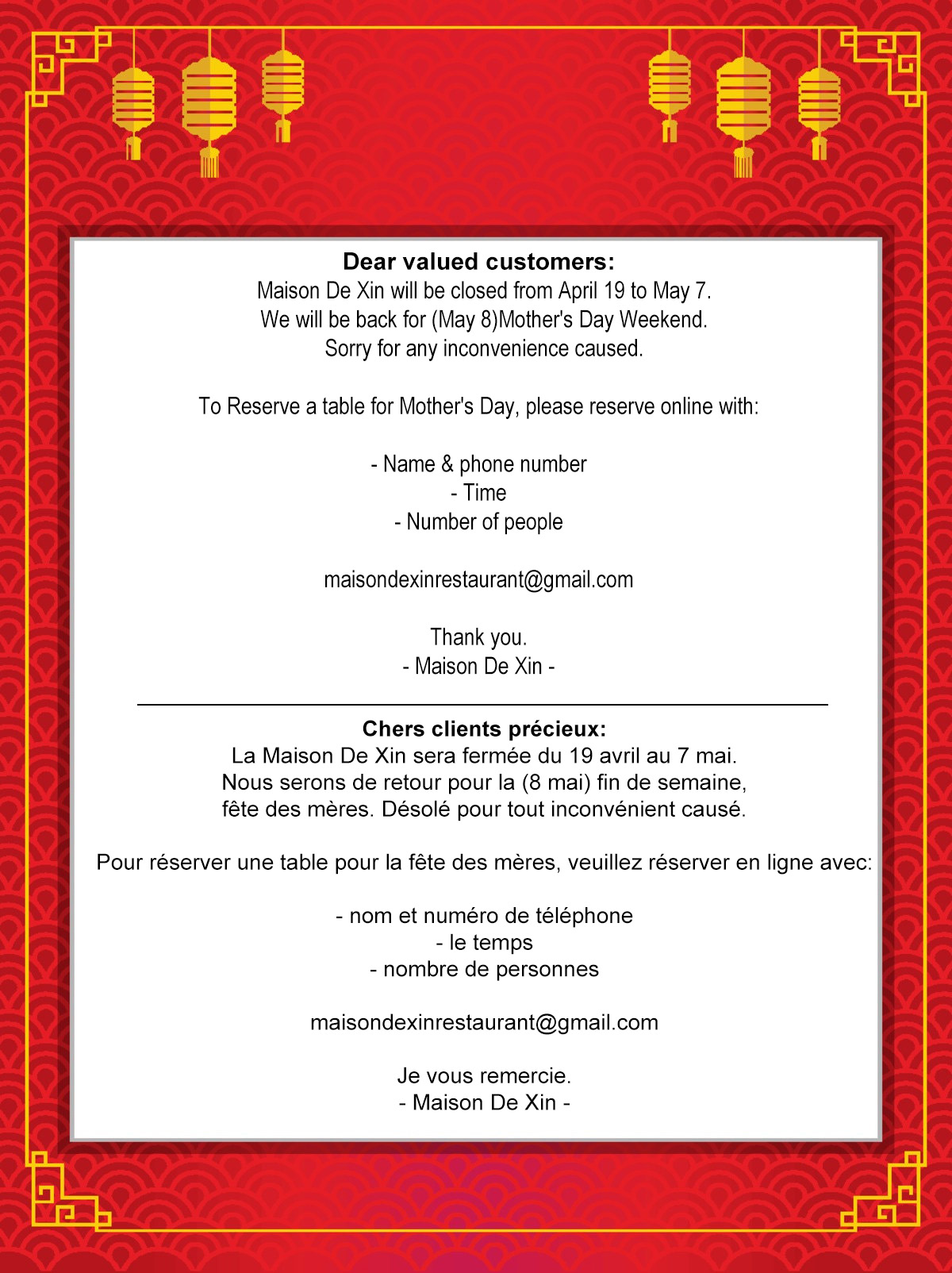 Our goal is to provide you optimum customer service and a delightful food experience, of course. At Maison de Xin, we truly emphasize on quality, community and service. Each of our chefs are really skilled with over 10 years of culinary experience and will consistently serve you fresh and flavourful Chinese food from the wok. Our professional team is bilingual and responsive, ready to assist and fulfill your needs or questions. And don’t worry our restaurant is always clean and well taken care of. That’s why we are Health Inspector approved (just check out our front entrance). We can’t thank our clients enough for their loyalty and friendliness.